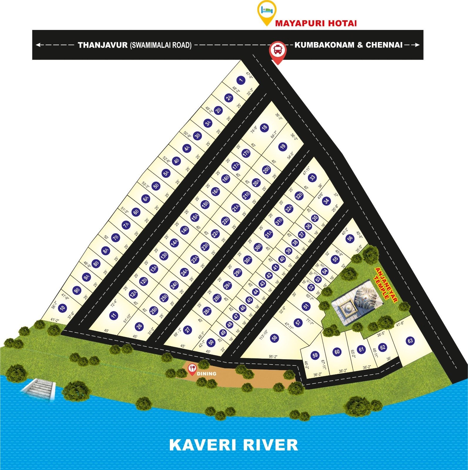 Located at banks of Cauvery river abundant greenery & landscape adjoining kumbakonam & swamimalai temples close to greeneryanscape kumbakonam bye pass road.